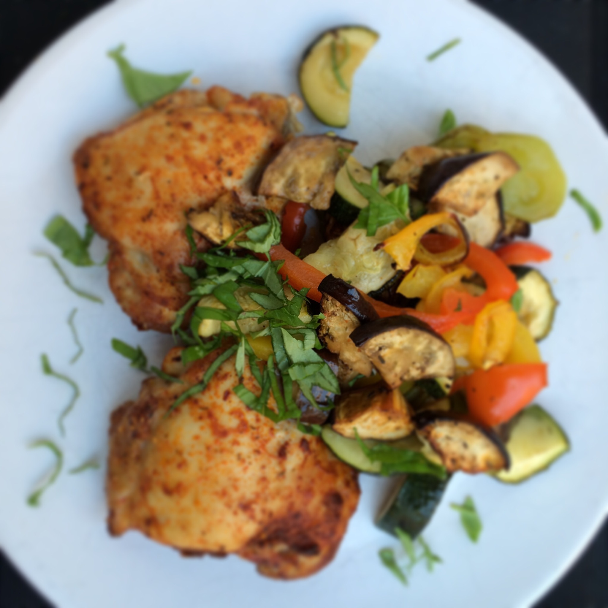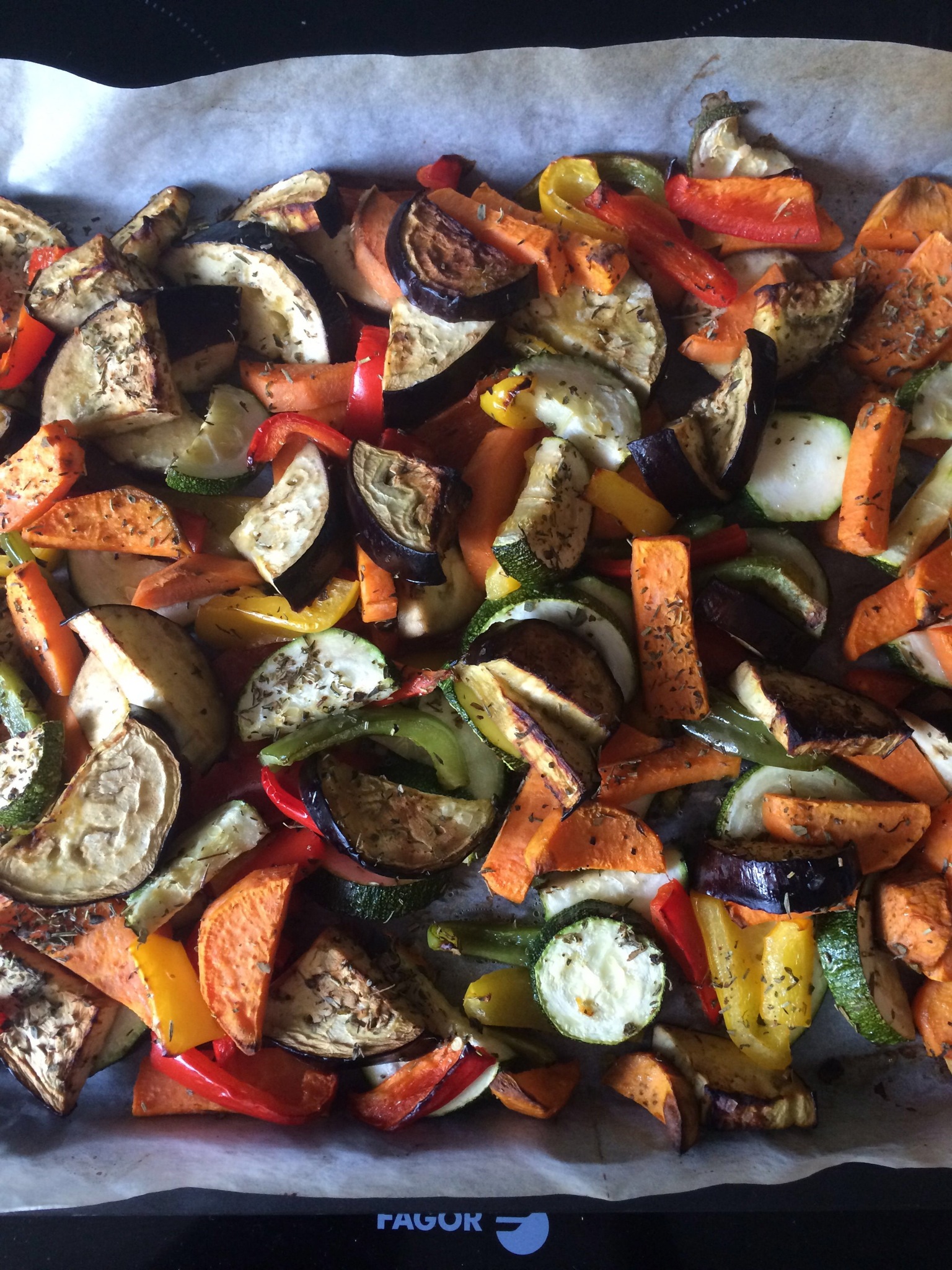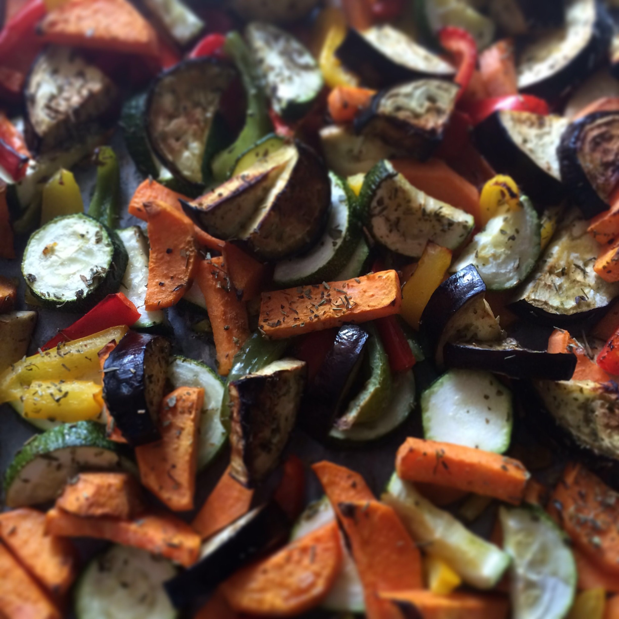 Recipe: (4 people). At your green-grocer get the following: 1 zucchini, 1 eggplant, 1 sweet potato, color blend of bell peppers and some mixed dried mediterranean herbs (basil, parsley, thyme, rosemary, etc.), a high quality olive oil and sea salt. Preheat the oven to 200 degrees Celcius. Baking paper on your oven tray, cut all vegetables into large pieces, making sure the vegetables that have a shorter cooking time (like zucchini) need to be bigger than the vegetables with longer cooking time (like the sweet potato). Put all sliced vegetables in a large bowl, sprinkle with olive oil (1-2 tbs), add the dried herbs and sprinkle the sea salt. Mix it all so that the oil and herbs are nicely distributed around the veggies, then put it all on the oven tray. Cook for 25-30 minutes until the veggies are nicely browned by the heat of the oven. Delicious as side dish next to for example grilled chicken or roast beef. Enjoy!
