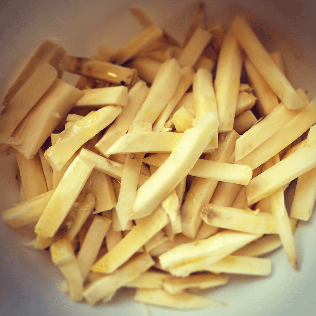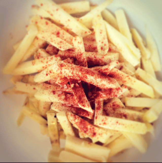 Sweet potato fries. recipe; supplies; An oven pre-heated to 200 degrees Celsius. ingredients; 1 large (or several small, total 1 kg) sweet potato, coarse sea salt, fresh rosemary, paprika, olive oil. Peel the potatoes and cut into salty slices about 1cm thick. Then, cut these slices strips 1 cm thick, so you get the shape of fries. Put these in a large bowl, pour a dash of olive oil, a teaspoon of coarse salt, 1 tbs paprika and fresh rosemary. Everything good mix and then on a baking tray lined oven do. In 25-30 minutes you cook the fries crispy in the oven! Delicious side dish!