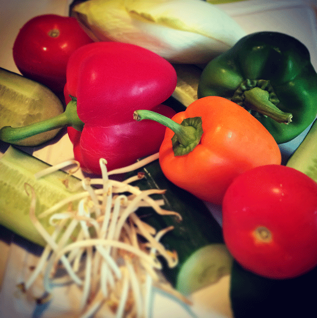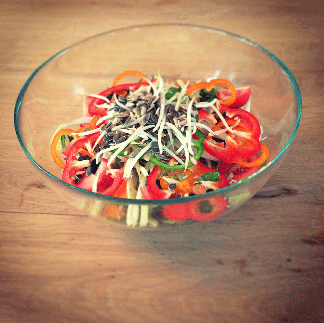Fresh salad; You can make salads in all shapes and sizes, with different ingredients. Use your imagination! Here one of my recipes for a fresh salad packed with vitamins! Recipe; Take 1/2 cucumber, 3 different colors of peppers, 2 tomatoes, 1 chicory, 1 handful of bean sprouts, various nuts and seeds as a garnish. Wash and cut the various vegetables. Make sure it has a size easy to eat, so you do not have to rake! Present your salad for example in a nice big bowl. With some olive oil, balsamic vinegar, salt and pepper it will make it a delicious and healthy salad with a light dressing! Enjoy!