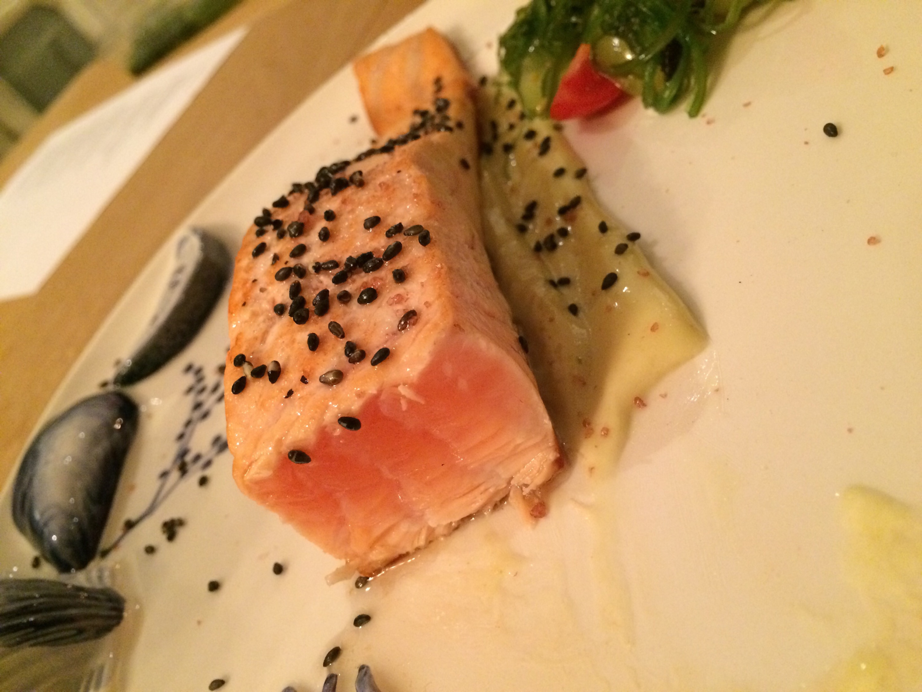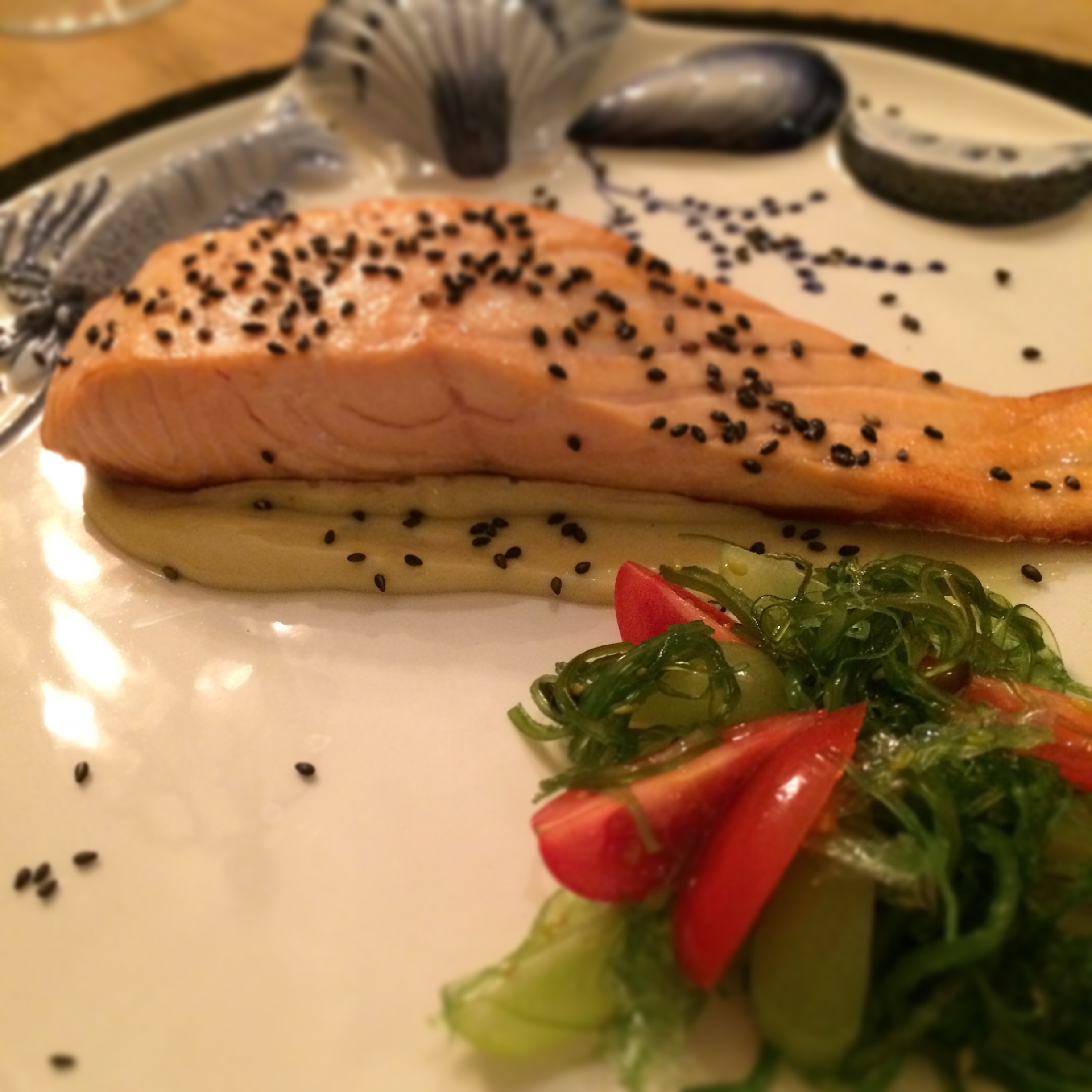 Ingredients (2 persons): 2 portion of fresh (wild) salmon, some black sesame seeds, seaweed salad, white grapes, small tomatoes, homemade mayo, wasabi (fresh or paste). Start to make the mayo (see the post ‘homemade mayo’ , mix a little of the (fresh) wasabi paste with it…taste it every time before you add more wasabi paste, it can become easily very ‘spicy’…Put with a spoon some of the wasabi mayo on a plate. To make the salad; get the grapes and tomatoes and cut them in 4 parts (taking the direction of the longest side of it). Add the seaweed-salad and serve on the plate or in a small bowl a side. Then heat your (grill pan), add some olive oil or coconut butter and grill the fish for a couple of minutes on the ‘skin side’. then flip upside down and leave it for a few seconds, just so that the outside looks cooked, but the inside is still raw. Serve on top of the wasabi mayo and add some black sesame seeds for decoration. Enjoy your meal!